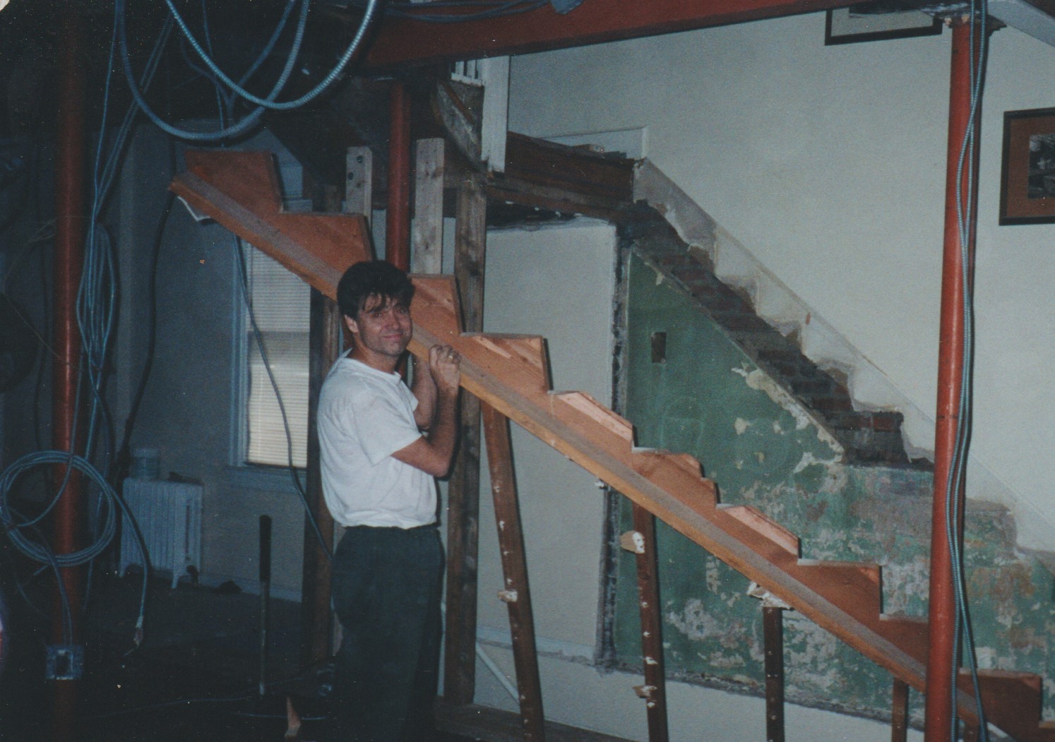 | Floyd holding a stair stringer. We dismantled the stairway and rebuilt it as original. |